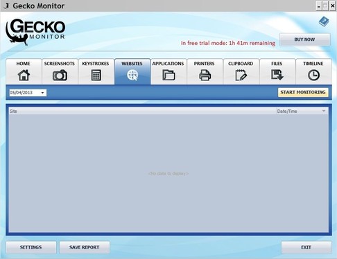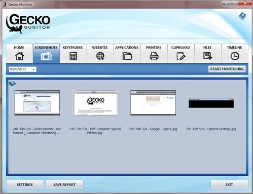 After this initial setup, simply slick "Start Monitoring". Gecko then hides itself and will begin recording the computer activity you have specified (keystrokes, screen activity, open programs, etc.). You can also choose to have the program launch at startup and begin monitoring.
